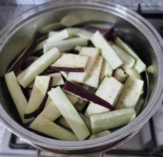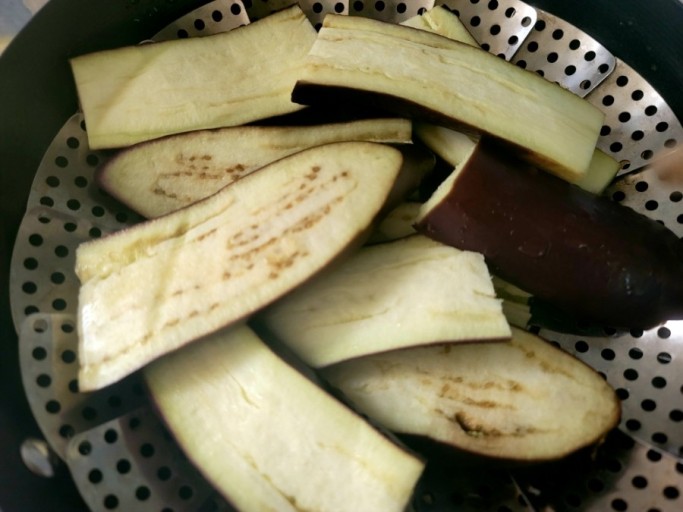- 찜기에 물을 넣고 끓인 후, 가지를 찜기에 넣고 약 5분간 찝니다. 가지가 부드럽게 익으면 꺼내서 식힙니다.