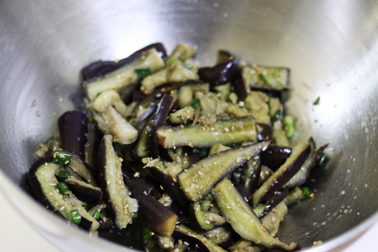 - 찐 가지를 한 김 식힌 후, 손으로 찢어 양념장에 넣습니다.