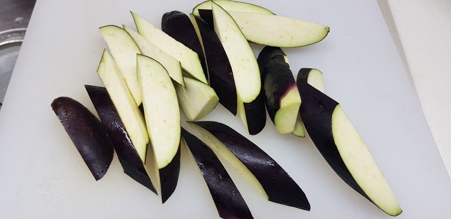 - 가지를 깨끗이 씻은 후 길이로 반을 자르고, 다시 4 등분하여 먹기 좋은 크기로 썹니다.