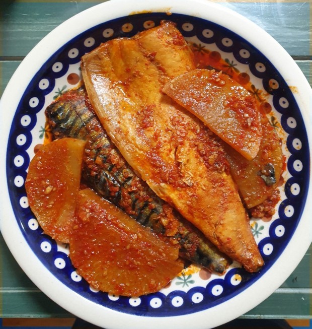 재료 : 고등어2마리, 무, 양파, 대파, 고추, 물, 설탕 한 스푼, 다진 생강 1/3 스푼, 다진 마늘 1스푼, 된장 반 스푼, 들기름 2스푼, 고춧가루 3스푼, 간장 반 컵