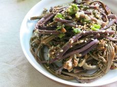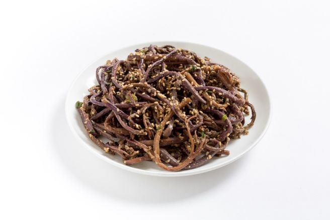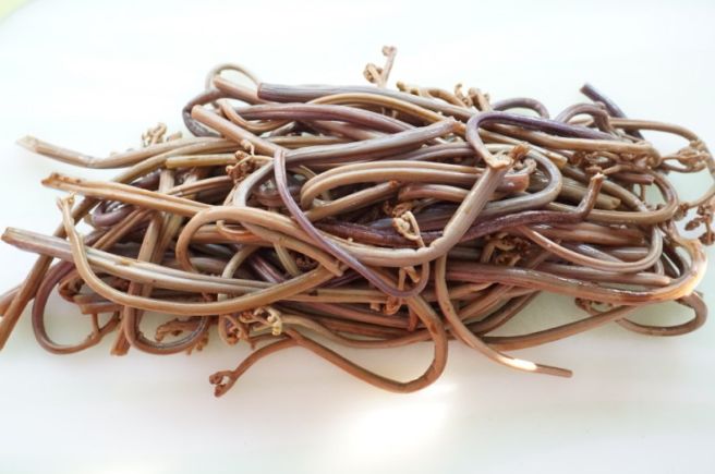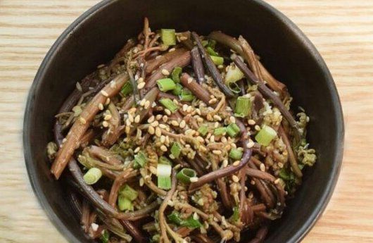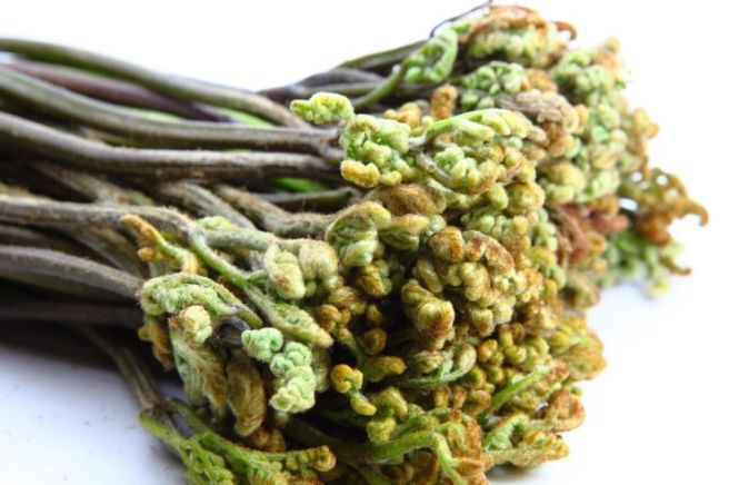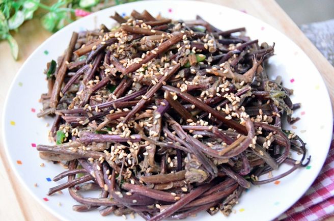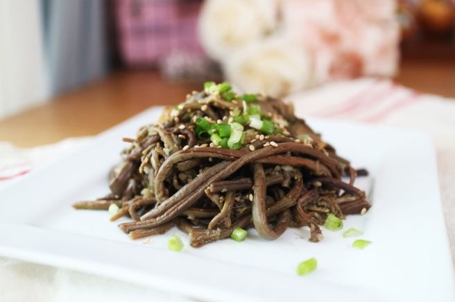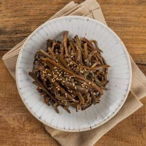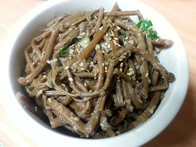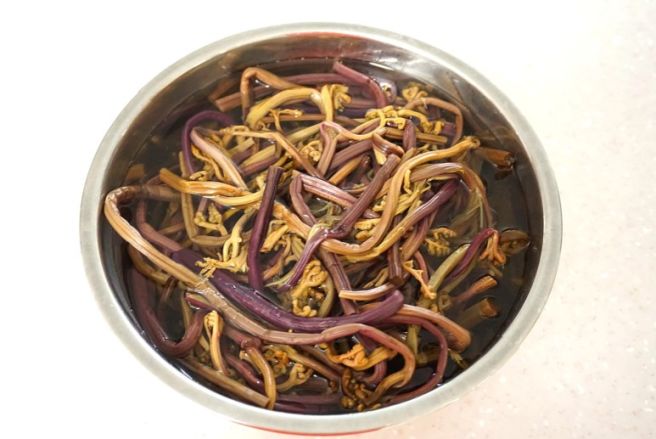 - 삶은 고사리는 찬물에 헹구고 질긴 섬유질을 제거합니다.