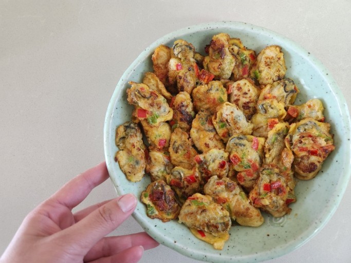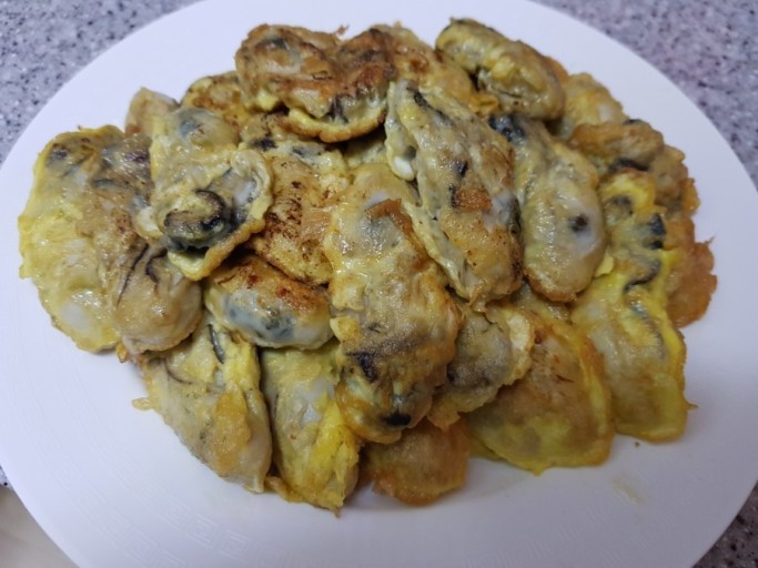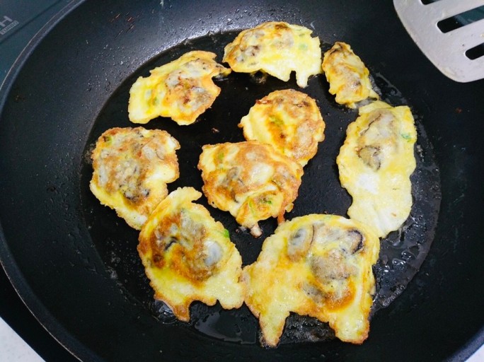 - 팬에 기름을 두르고 중불로 예열한 후, 준비한 굴을 하나씩 올려서 지져줍니다. 양면이 노릇노릇하게 익을 때까지 구워줍니다