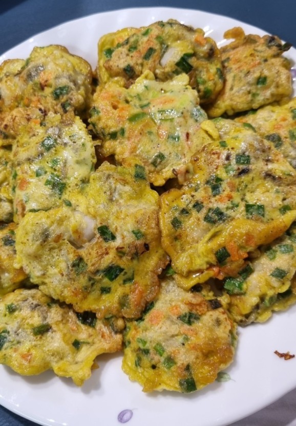 - 굴을 한 알씩 떠서 팬에 올리고, 노릇해지면 뒤집어 굽습니다