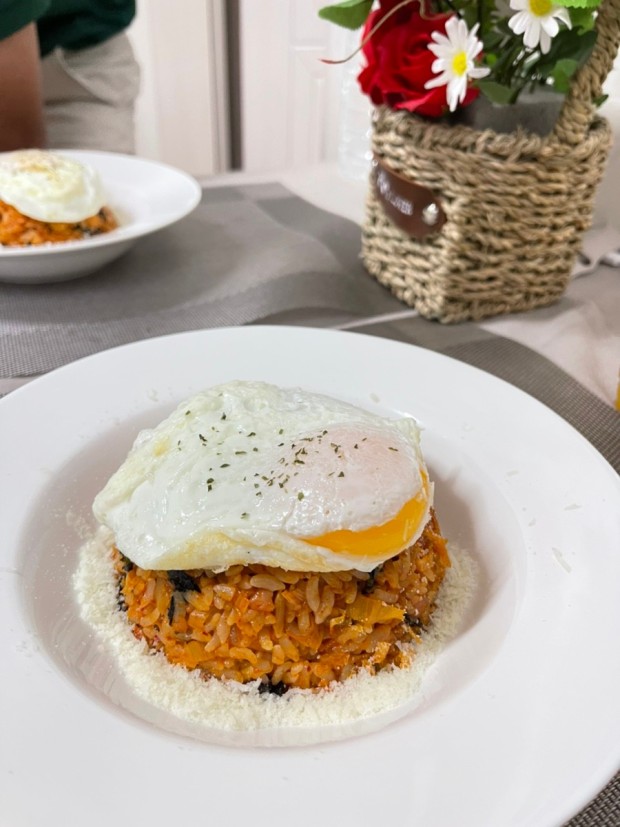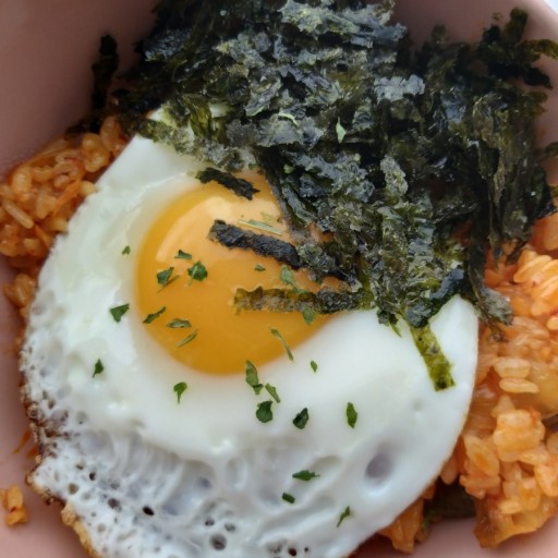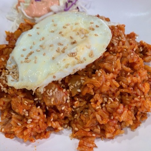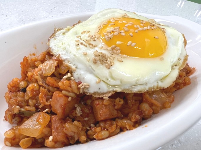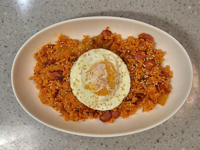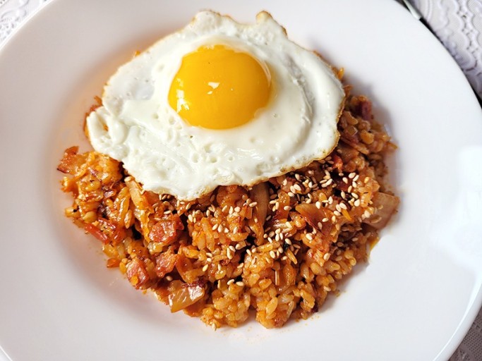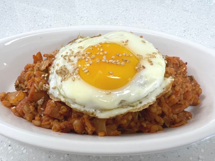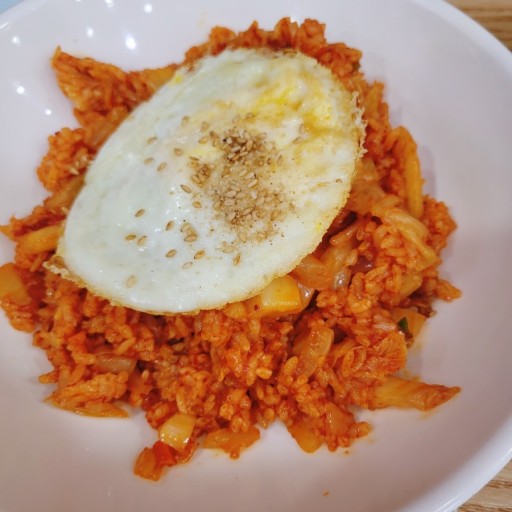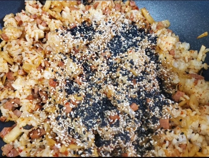 - 팬에 밥이랑 김치가 어우러지면 깨를 뿌려주며요 계란프라이 만들어서 곁들이면 완성입니다.
