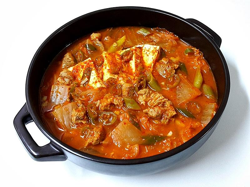 재료: 묵은지 1/4포기, 돼지고기 100g, 양파 1/4개, 두부 1/2모, 대파, 마늘 1스푼, 고춧가루 1스푼, 된장 1/2스푼, 설탕 약간, 김칫국물 1컵, 물 2컵