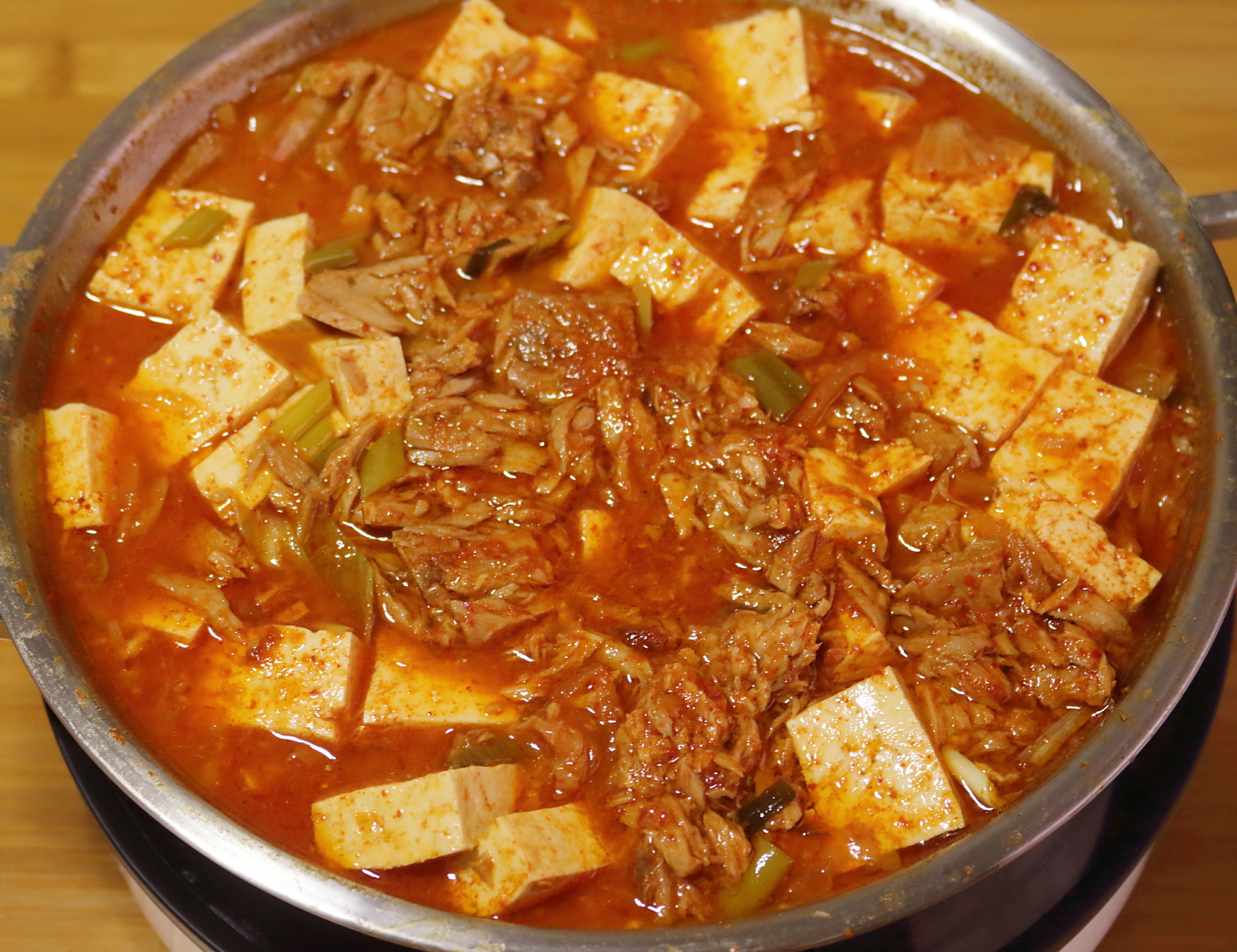 - 두부를 넣고 5분 정도 끓인 후 중불로 줄여 10분 정도 더 끓인다.