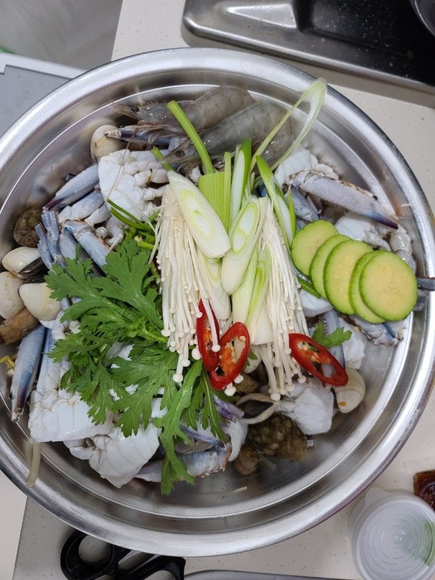 재료 : 꽃게, 국물용 멸치, 다시마, 물, 된장, 단호박, 무, 팽이버섯, 고춧가루, 양파, 다진 마늘, 모시조개, 당근, 풋고추, 홍고추, 고추장, 매실액, 후춧가루, 전복, 새우, 대파, 생강, 미나리, 부추, 쑥갓