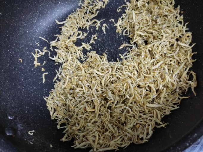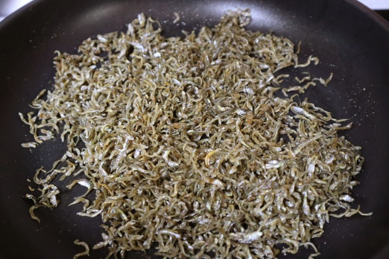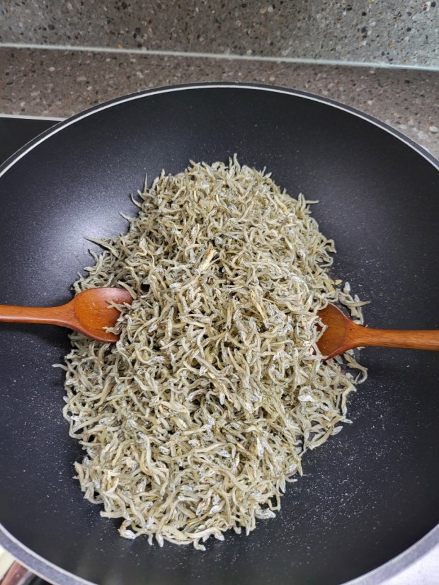 - 마른 팬에 잔멸치를 센 불에 약불로 줄여 1분가량 볶아 비린내와 수분을 제거한다.