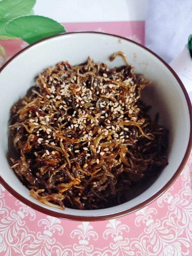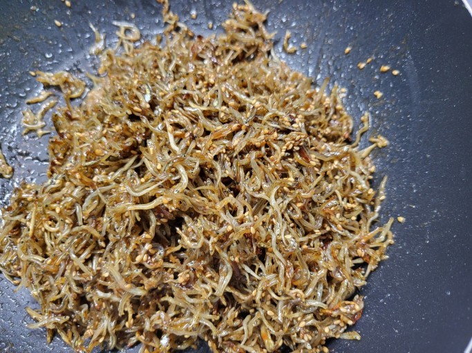 - 불을 끄고 올리고당과 통깨, 매실액을 넣고 재빨리 버무려 윤기 나고 부드럽게 완성한다.