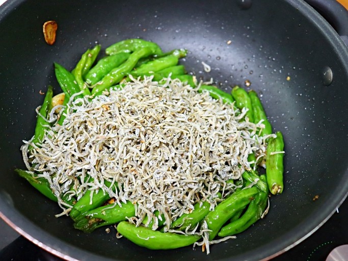 - 팬에 기름을 두르고 멸치와 꽈리고추를 함께 넣어 볶는다.