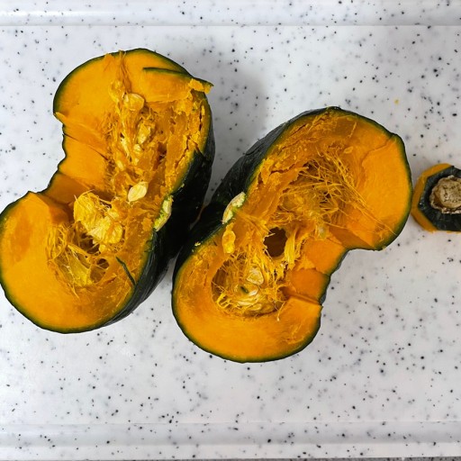 - 단호박을 깨끗이 씻고 반으로 자른 후 씨를 제거합니다.