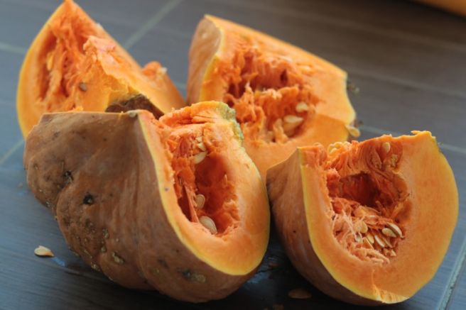 - 단호박을 깨끗이 씻고, 반으로 잘라 씨를 제거한 후 껍질을 벗기고 작은 조각으로 썰어줍니다.