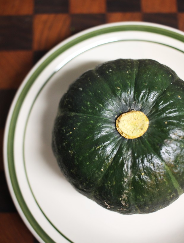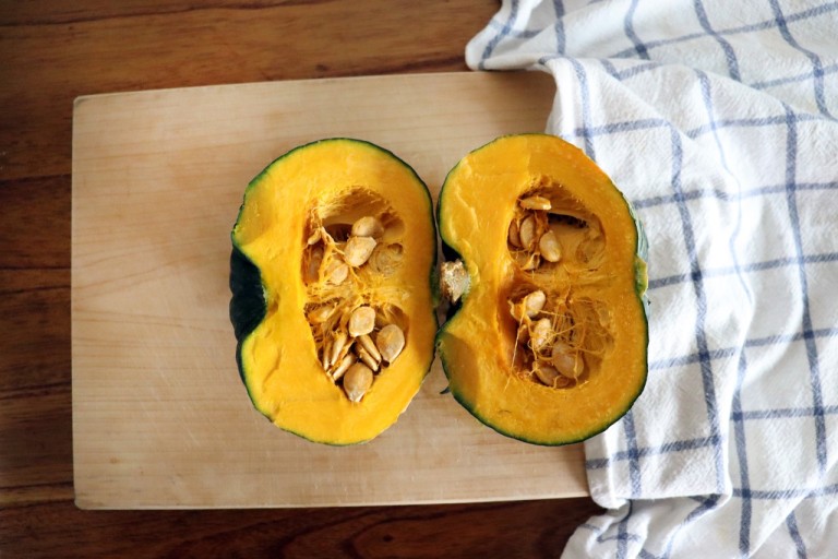 준비: 단호박을 반으로 자르고, 숟가락으로 씨와 속을 파냅니다. 꼭지를 제거합니다. (단호박을 전자레인지에 2분간 돌리면 자르기 쉬워집니다.)