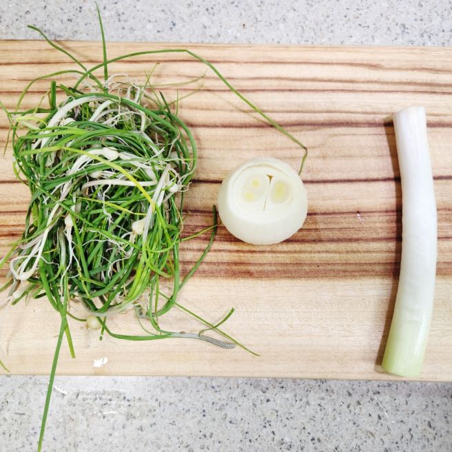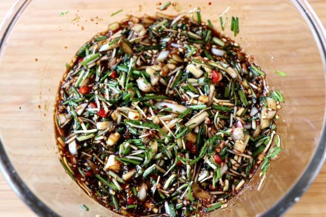 - 달래 손질하기: 달래의 뿌리 쪽 딱딱한 부분을 제거하고 깨끗이 씻은 후, 칼 옆면으로 달래 머리 부분을 눌러 잘게 송송 썰어줍니다.