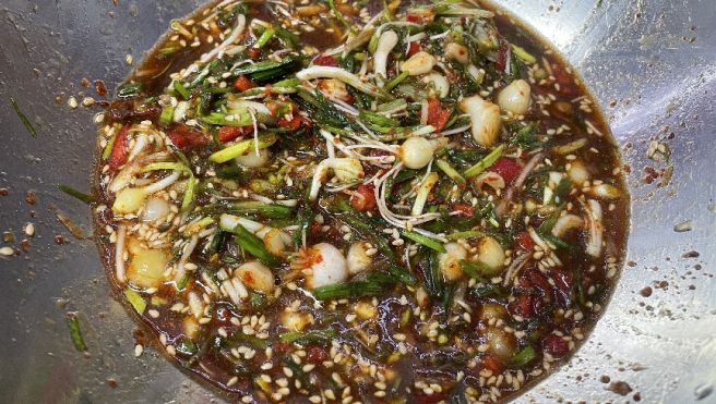 - 재료 혼합하기: 준비한 달래와 고추를 양념장에 넣고 잘 섞어줍니다.