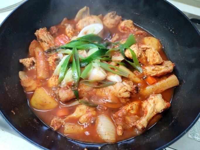 - 원하는 국물의 농도가 나올 때까지 졸여주는 것이라 보면 되고요, 농도를 맞춘 후 대파, 청양고추, 홍고추, 후춧가루를 넣으면 닭도리탕이 완성돼요.