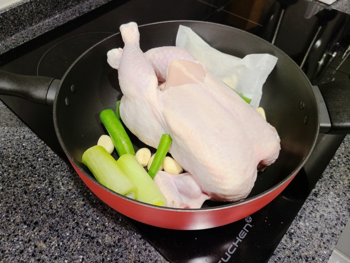 - 냄비에 손질한 닭을 펼쳐 넣고 표고버섯, 통마늘, 대추, 한방팩, 대파, 양파 반 개를 넣는다.