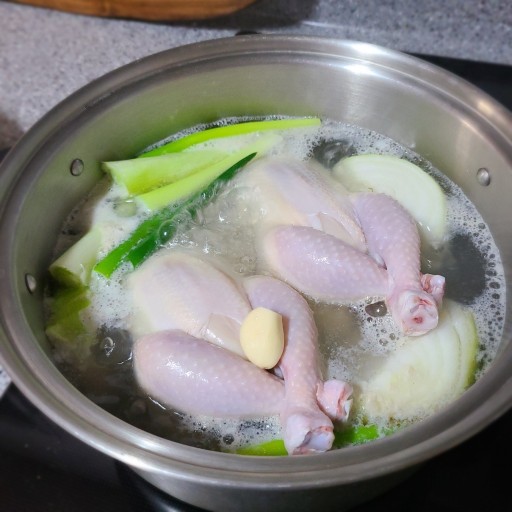 - 닭발과 대파, 양파, 무, 마늘, 생강, 통후추를 냄비에 넣어 닭백숙 육수를 만듭니다. 닭발을 사용해 진하고 깊은 맛을 냅니다.