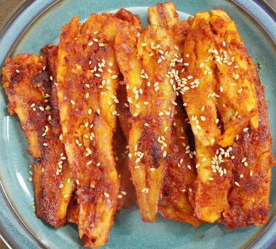 - 더덕에 밑간 재료를 바르고 약불에서 앞뒤로 노릇하게 구워줍니다.