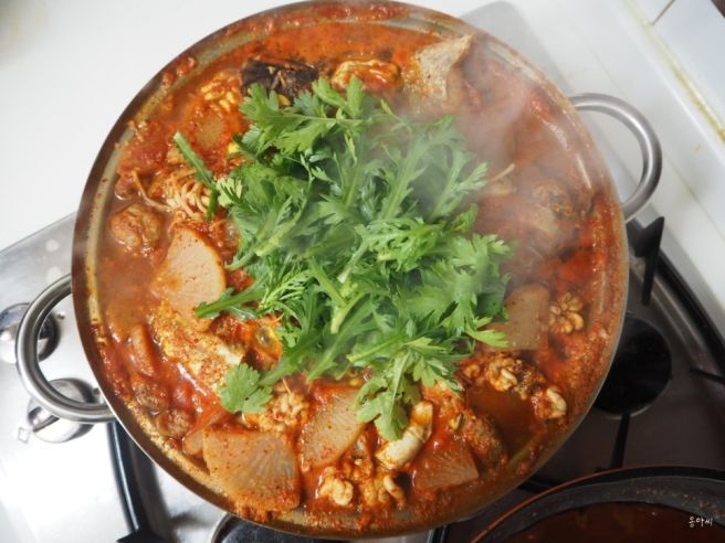 - 마지막에 쑥갓을 넣고 살짝 익혀 마무리합니다.