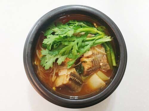 - 두부, 대파, 홍고추, 청양고추를 넣고 한소끔 더 끓인 후 미나리를 넣습니다. 마지막으로 꽃소금으로 간을 맞추고 식초(1큰술)를 넣어 마무리합니다.