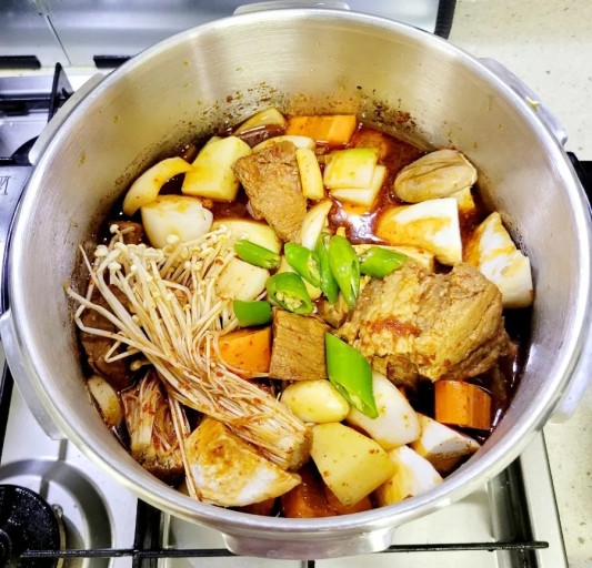 - 갈비를 양념과 함께 강불에서 20분 정도 끓인 후, 무와 당근 등의 채소를 넣고 중약불에서 20분 더 끓입니다.