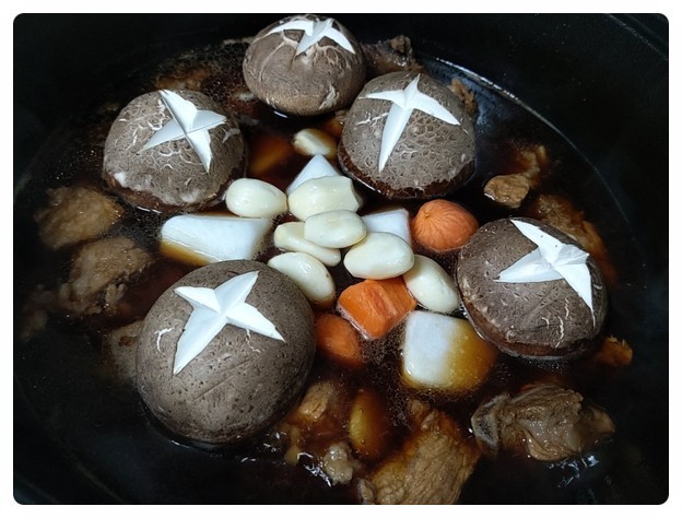 - 양파, 표고버섯, 대파를 넣고 국물이 자작해질 때까지 5분 정도 더 조립니다.