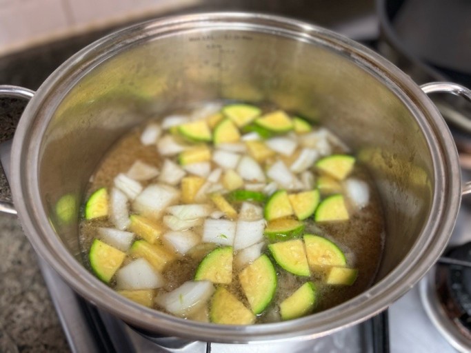 - 어느 정도 기름이 나오고 볶아졌을 때 미리 썰어둔 애호박과 감자를 넣고, 더 볶아 준다.