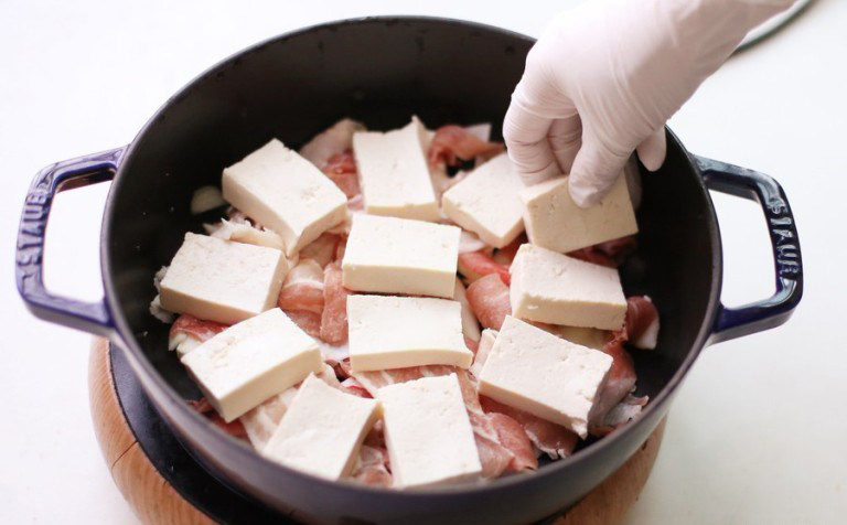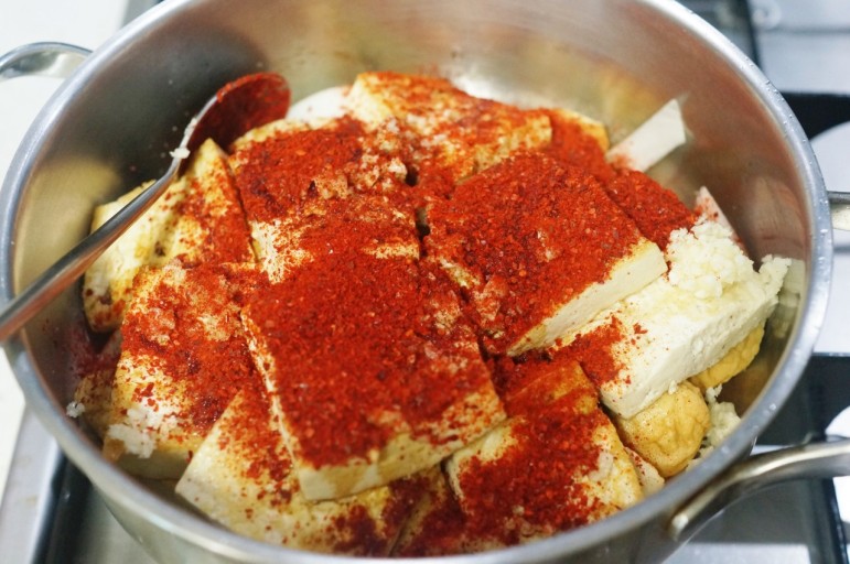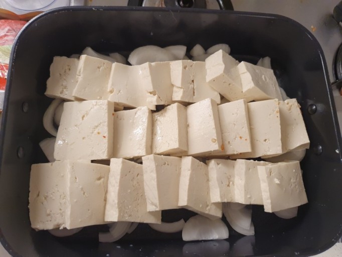 - 웍이나 냄비에 양파를 깔고 그 위에 두부를 가지런히 놓는다.