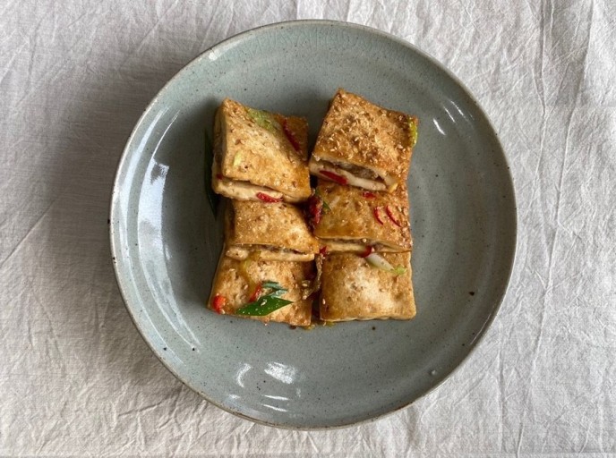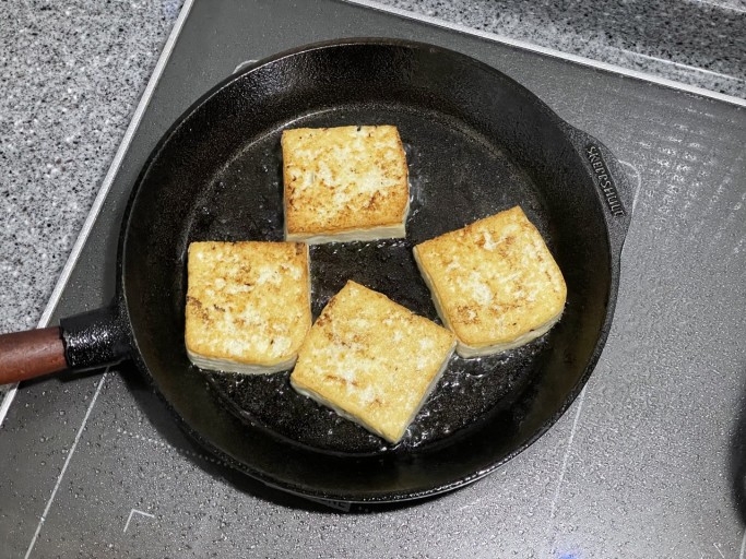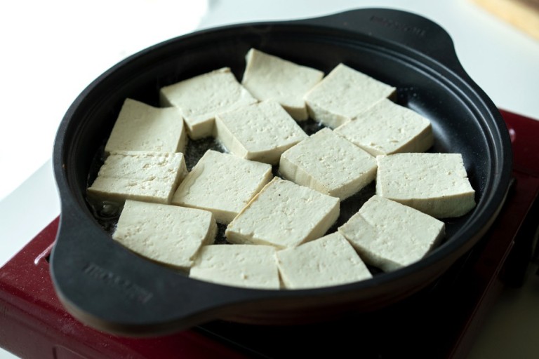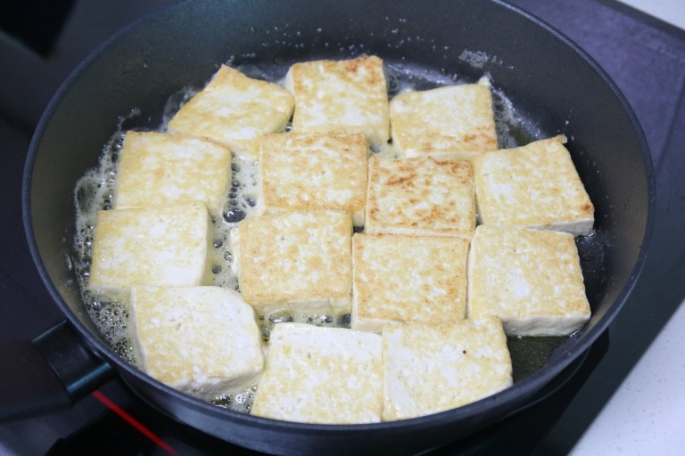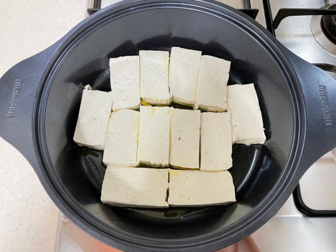 - 충분히 물기가 빠진 두부를 먹기 좋게 잘라 프라이팬에 올리브유를 두르고, 굽는다.