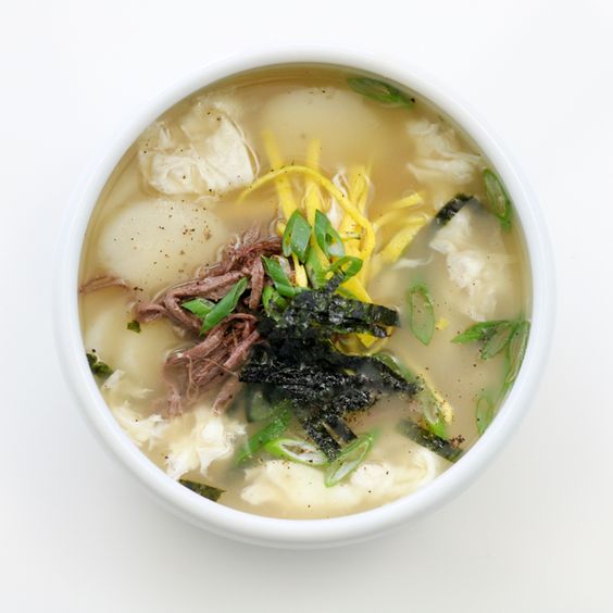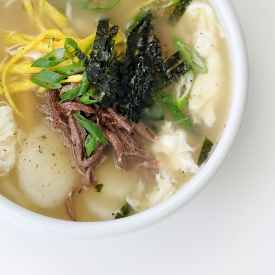 재료 : 소 우둔살 300g, 참기름 2 큰술, 청주 3 큰 술, 물 1.2L, 떡국떡 400g, 참치액젓 3 큰 술, 달걀 2개, 대파 약간, 김 가루 약간, 깨소금 1 큰 술, 다진 마늘 1 작은술, 홍고추 약간, 후춧가루 1꼬집