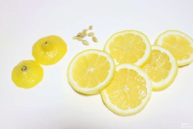 - 레몬의 양 끝을 잘라내고, 씨를 제거한 후 5mm 두께로 슬라이스합니다.