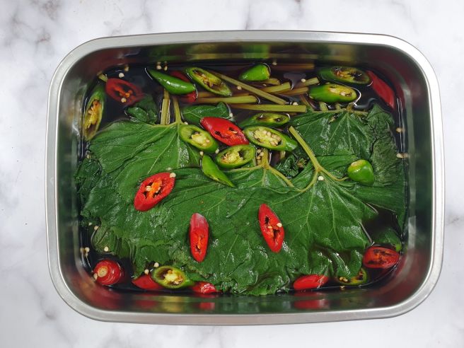 재료: 머위잎 350g, 소금 1큰술(데칠 때) , 물 1컵(200ml) 진간장 1.5컵(300ml) 설탕 1/2컵, 식초 100ml, 소주 100ml 매실액 1컵, 청양고추 2개, 홍고추 1개, 감초 1개
