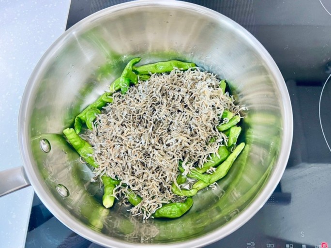 - 멸치가 살짝 바삭해졌다 싶으면, 먼저 잘게 썬 파를 소주컵으로 1컵 정도 넣어 준다. 파의 습기를 살짝 날려준 뒤, 청양고추도 넣는다.