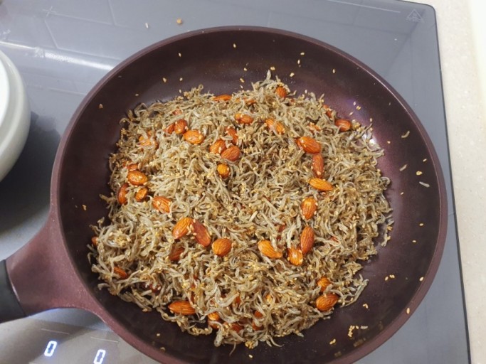 - 양념장이 바글바글 끓으면 애벌로 구워놓은 잔멸치와 아몬드 슬라이스 그리고 잣을 넣고 1분 정도 조려내어 그릇에 옮겨 통깨로 마무리한다.