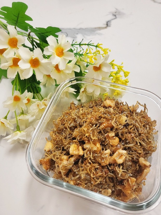 - 애벌 볶기 한 잔멸치를 팬에 넣고 마늘이 노릇해질 때까지 볶은 후 약 불로 줄여 한 번 볶아 낸 후 견과류를 넣어 준다.