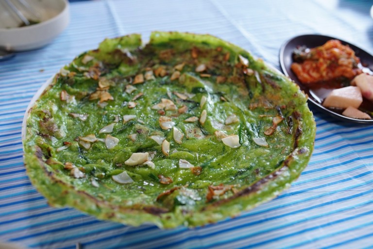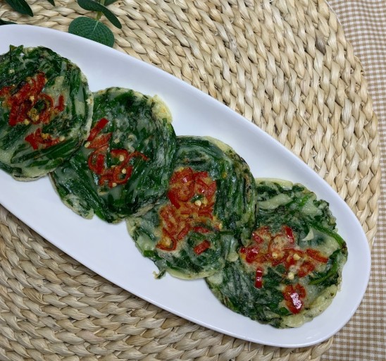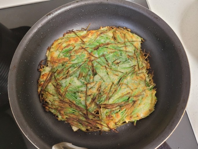 - 달군 팬에 식용유를 넉넉히 두르고, 반죽을 얇게 펴서 앞뒤로 노릇노릇하게 부친다.