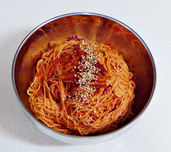 - 삶아 놓은 소면을 큰 볼에 담고 준비한 양념장을 넣어 골고루 비빕니다.