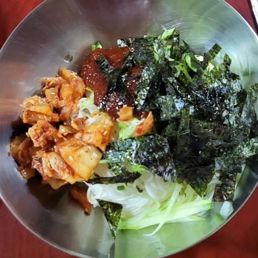 - 채소와 신김치, 데친 숙주를 올리고 참기름을 두른 뒤 얼음 두 개를 넣어 함께 비빈다.