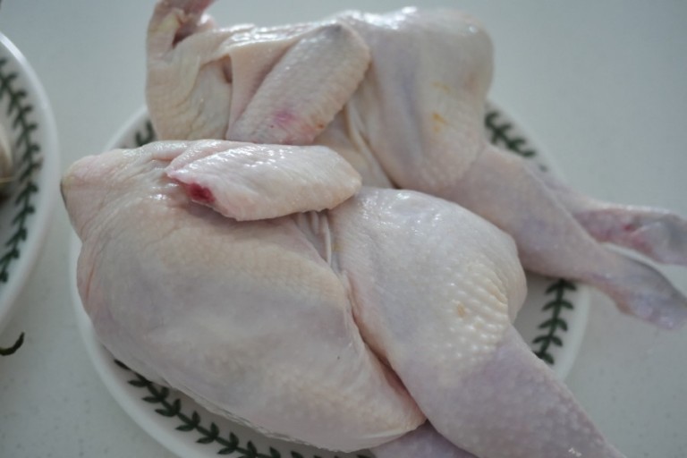 닭은 다야 칼로 쌈박하게 속까지 깨끗하게 씻은 후 꽁지를 잘라 잠시 맛술에 재워 두도록 한다.