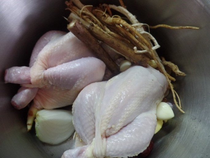 냄비에 위의 닭과 물을 붓고 인삼과 밤 그리고 대추, 마늘을 준비한 나머지 반 을 넣어 준 다음 약 1시간 정도 끓이다.