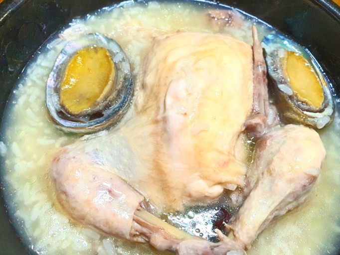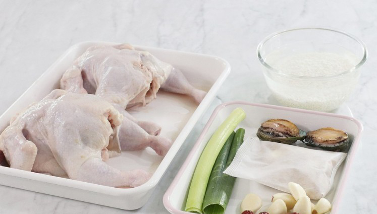 재료 닭 1마리, 전복 1마리, 인삼 1 뿌리, 마늘 6개, 대추 6개, 양파 1/2개, 불린 찹쌀 1/2컵, 대파 1줄기, 맛술 그리고 소금 약간