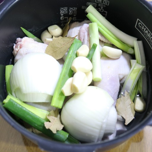 냄비에 물 3L를 넣고 손질한 닭을 넣고, 대파 2 뿌리, 양파 2개를 넣는다.