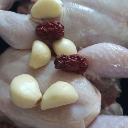 맛술에 재워둔 닭 안에 불린 불려둔 찹쌀과 대추 그리고 마늘을 넣고 대추를 넣어 준다.