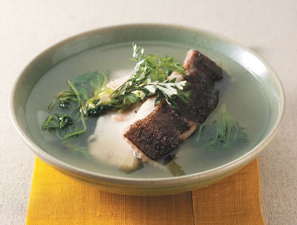 - 손질된 도다리를 넣고 이어서 쑥을 넣습니다. 쑥의 맛을 깊게 우려내려면 일찍 넣고, 향을 진하게 하려면 도다리가 익은 후에 넣습니다.
