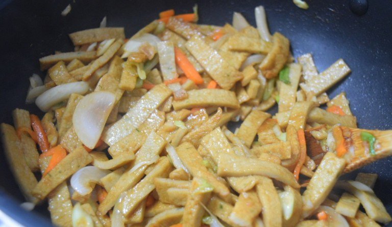 - 물기를 털어 웍에 어묵을 넣어 준 후에 채 썬 당근과 양파와 대파를 한 번에 넣어 준다.
