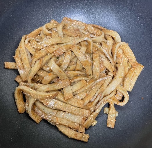 - 올리브유를 두른 후에 조림간장, 설탕 그리고 올리고당, 다진 마늘 마지막으로 참기름을 넣고 한번 더 빠르게 볶아 준다.