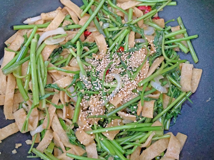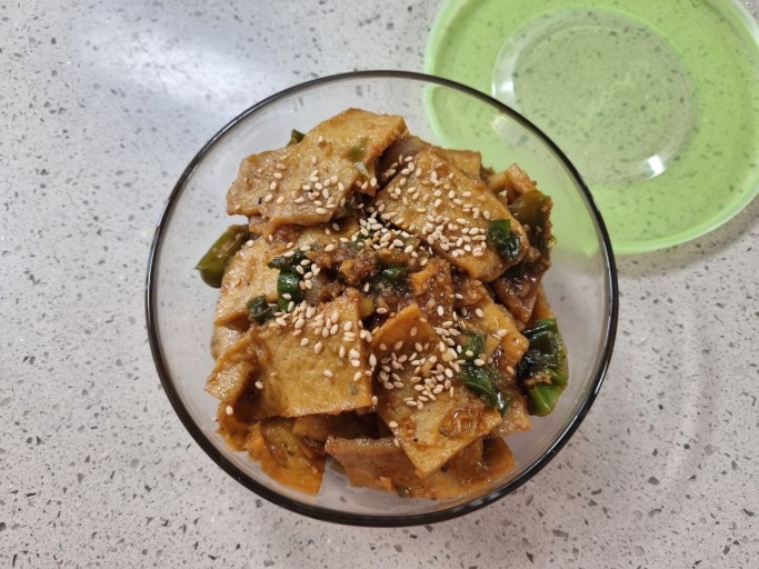 - 청양고추와 대파를 넣어 살짝 볶다가 마지막에 참기름과 통깨를 뿌려 마무리합니다.