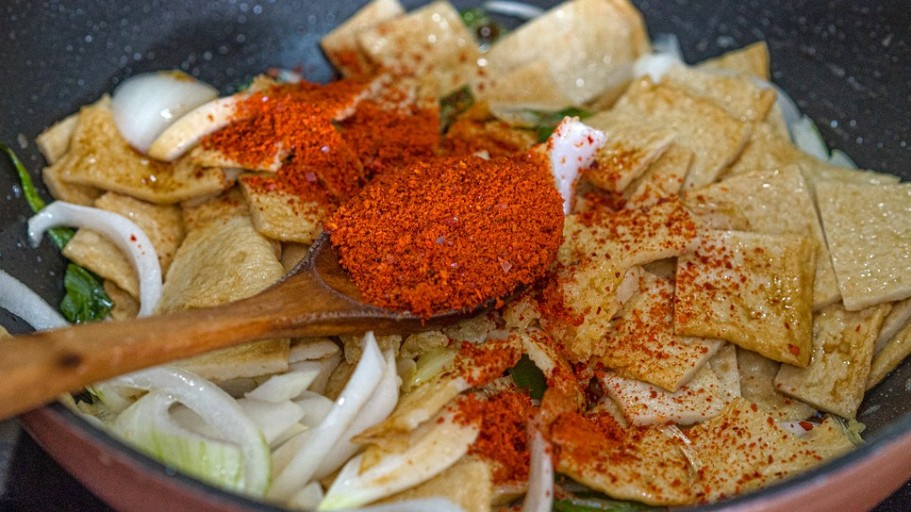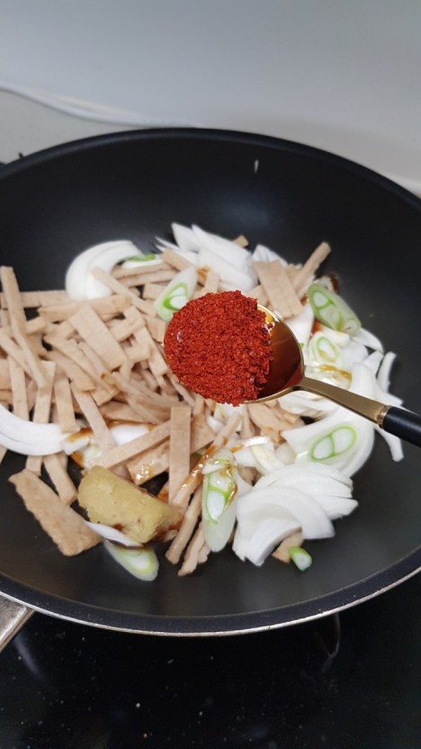 - 황설탕과 진간장을 넣고 볶으며, 고춧가루를 추가해 매콤한 맛을 더합니다.