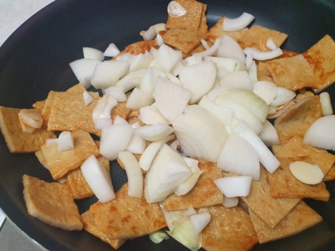 - 팬에 약간의 식용유를 두르고 어묵과 양파를 넣어 볶습니다. 양파가 반쯤 익으면 양념 재료를 넣고 2분 정도 볶아줍니다.